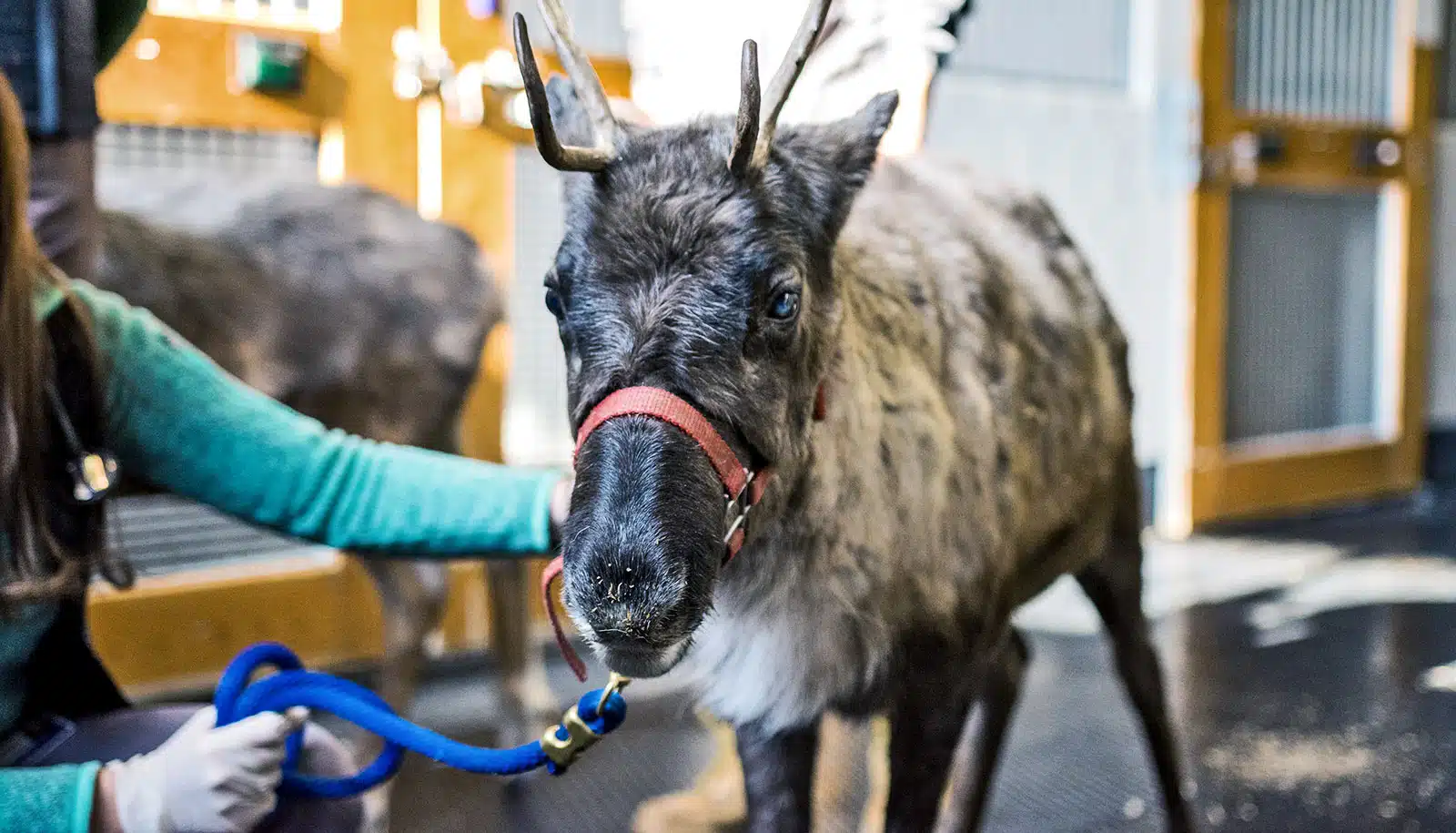 The Cornell University Equine and Nemo Farm Animal Hospital is equipped to keep many species of large animals, though special consideration was needed for Moose and Little Buddy. For example, bars and grill work on equine stalls would present some hazard to reindeer antlers that could get stuck. The hospital retrofitted a padded stall normally used for horses with neurologic conditions, closest to the end of the barn, where the door could be opened to let in cool November air. Little Buddy needed cold temperatures to be comfortable, so large box fans were hung in the stall.