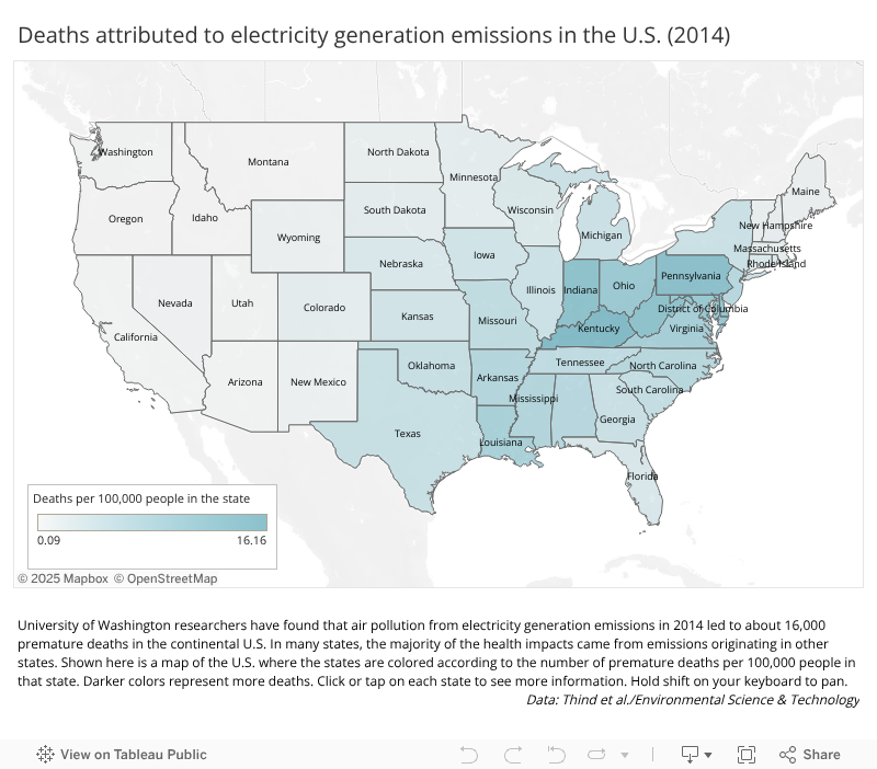 Then, using mortality data from the National Center for Health Statistics, the team estimated premature deaths due to electricity generation emissions. In 2014, there were about 16,000 premature deaths. The researchers estimate that 91% of premature deaths were the result of emissions from coal-fired power plants.