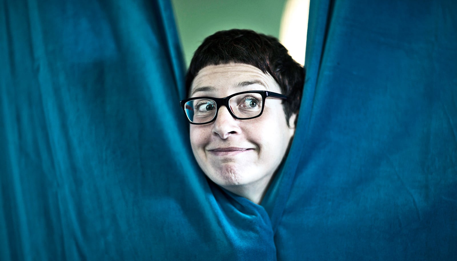 woman looking through curtain (artificial intelligence concept)