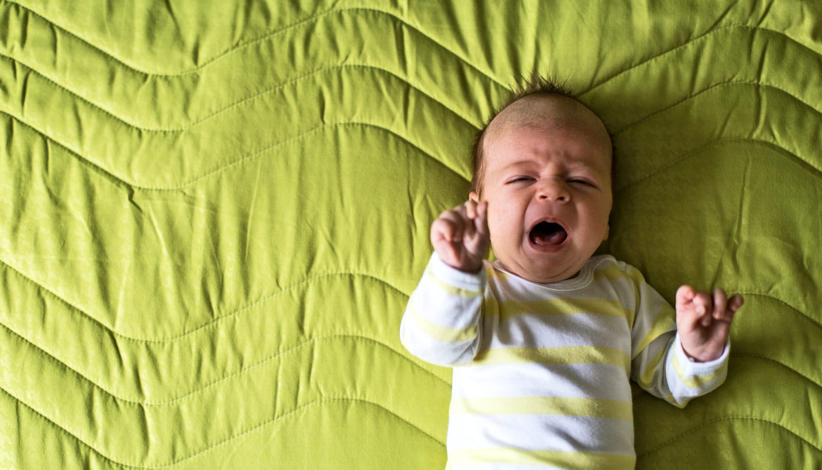 baby cries on green bedspread