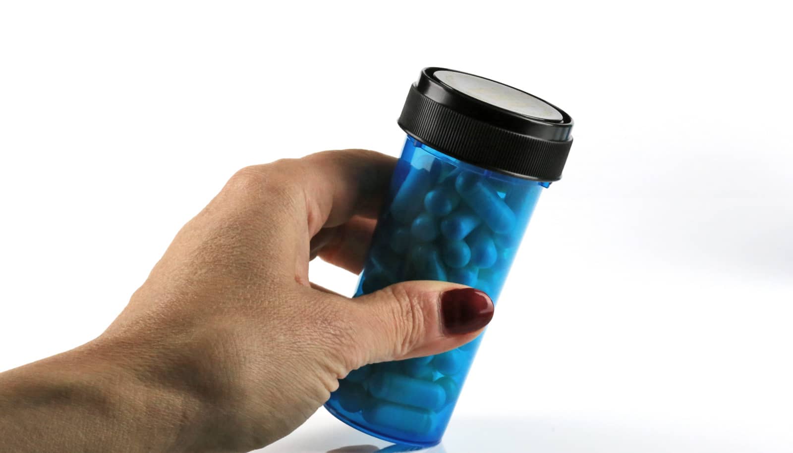 hand holds blue Rx bottle of pills