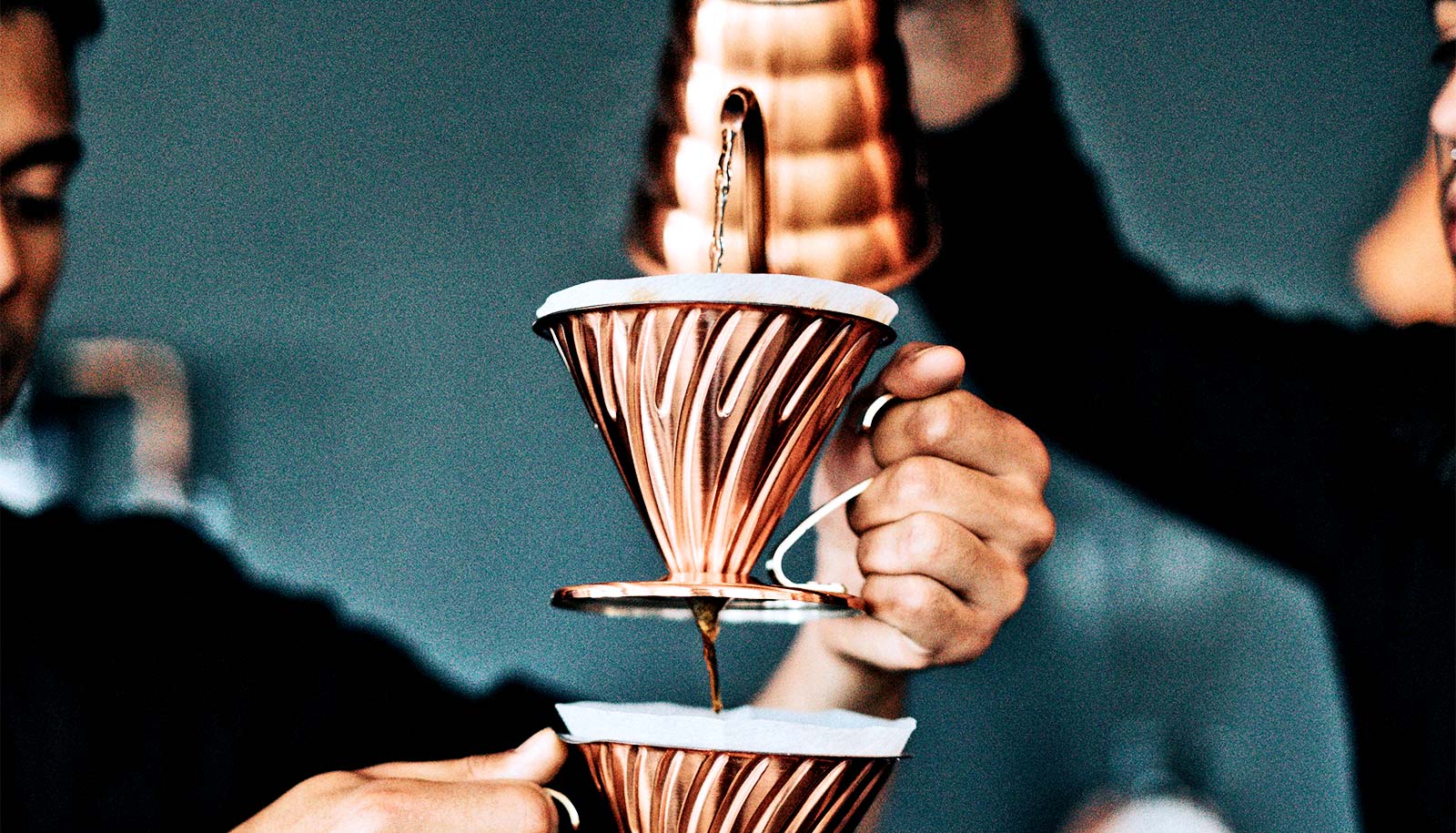 one person dressed in black pours water into a coffee filter that another person is holding, which then empties into another coffee filter below