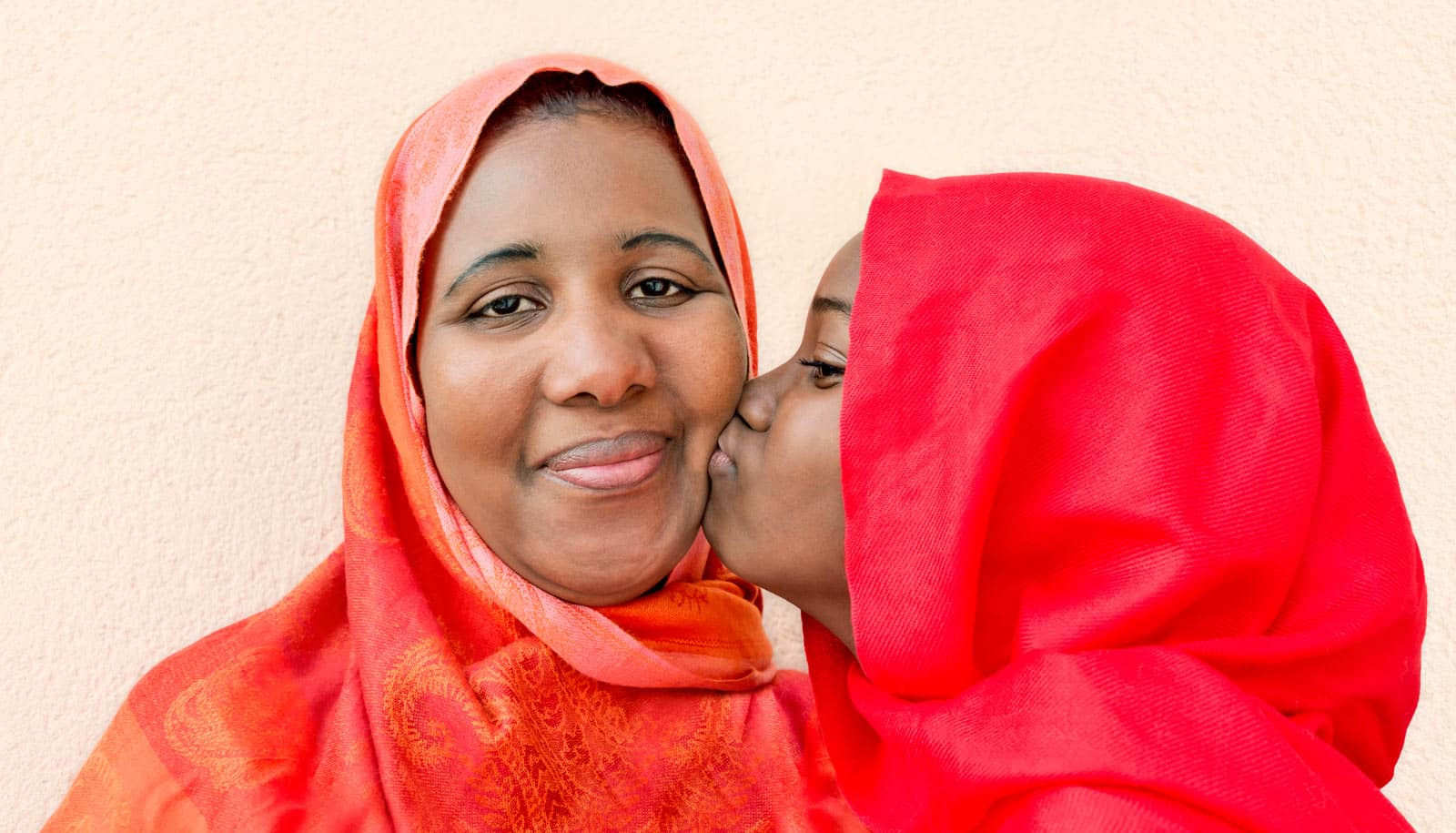 muslim mom and daughter in red