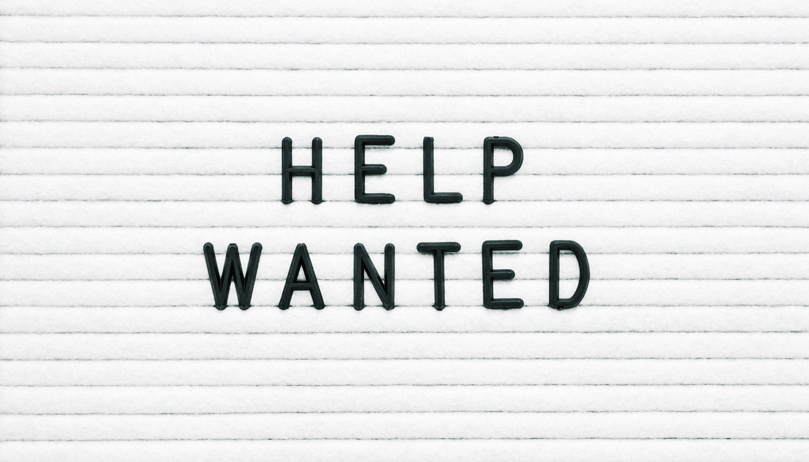 black "help wanted" on white sign