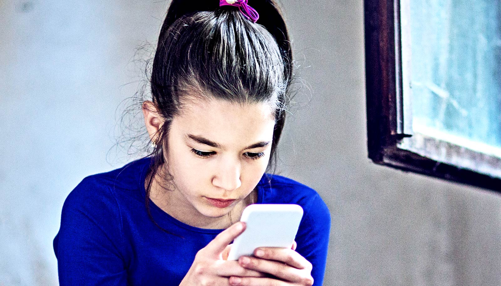 A young teen girl holds a smartphone and looks at the screen while sitting in a stairwell