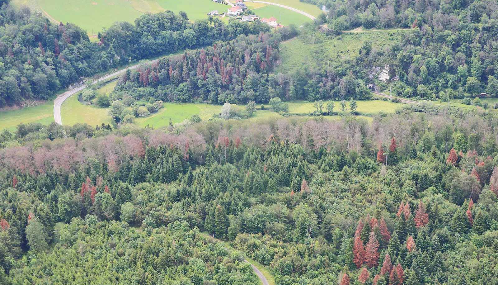An aerial shot of a forest with a band of dead, brown trees in the center of the image.