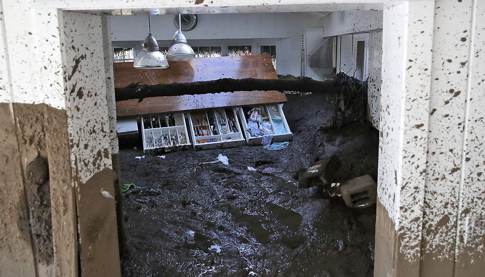 drawers fall from cracked counter in kitchen full of mud