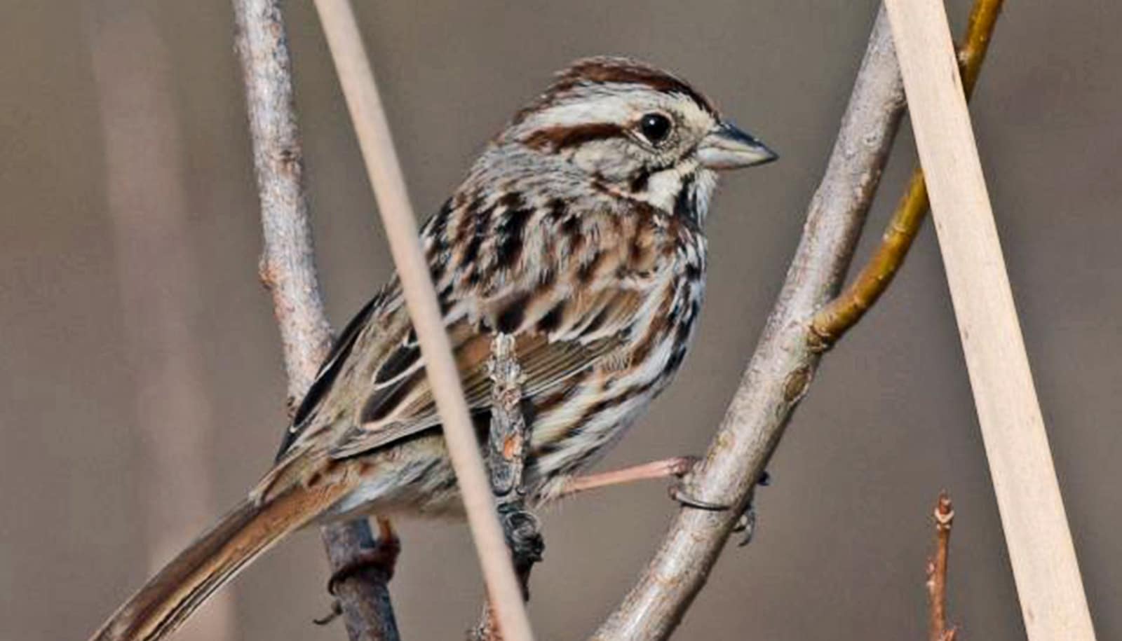 A male sparrow sits in a tree
