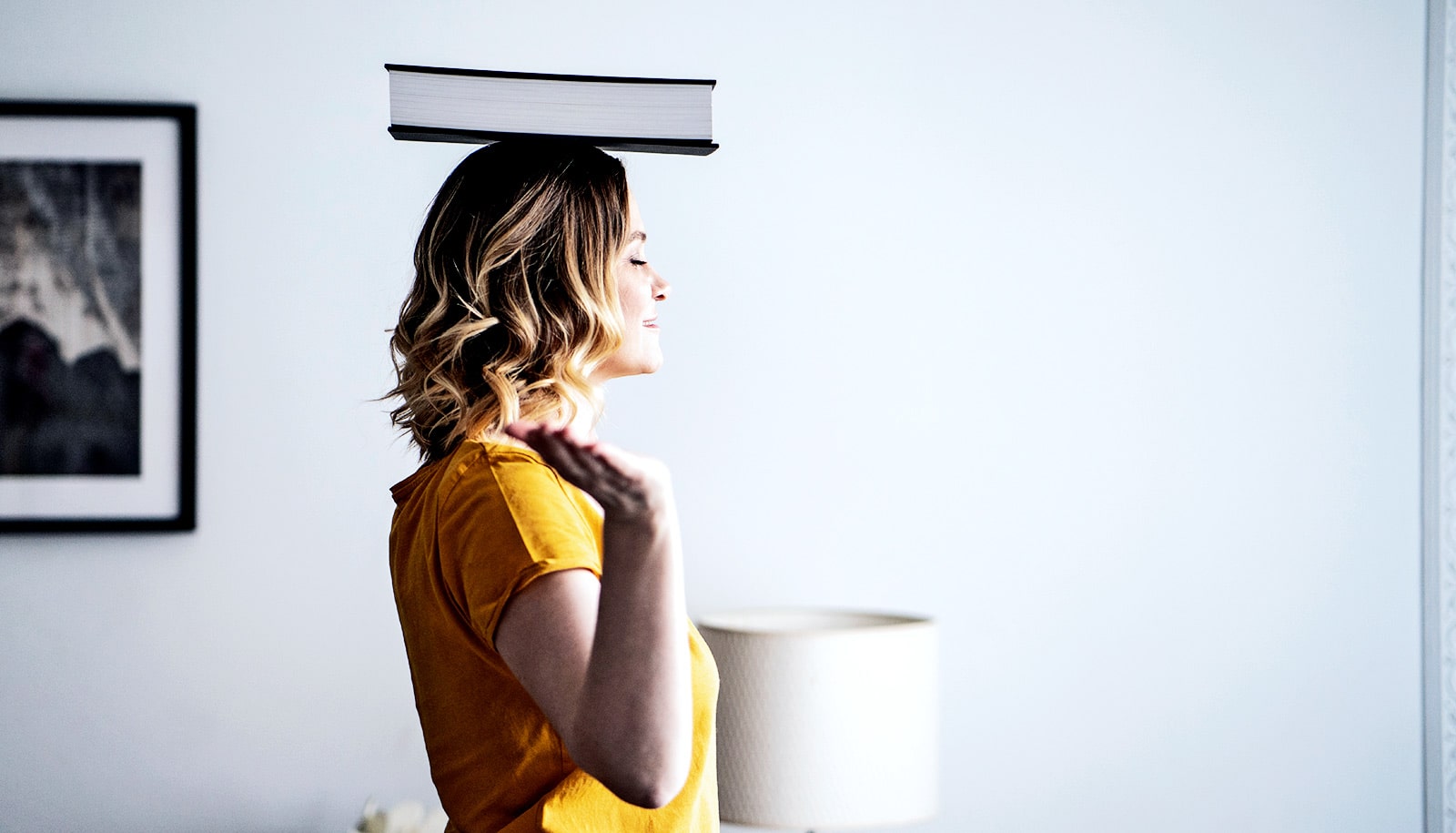 A woman stands with a book on top of her head.