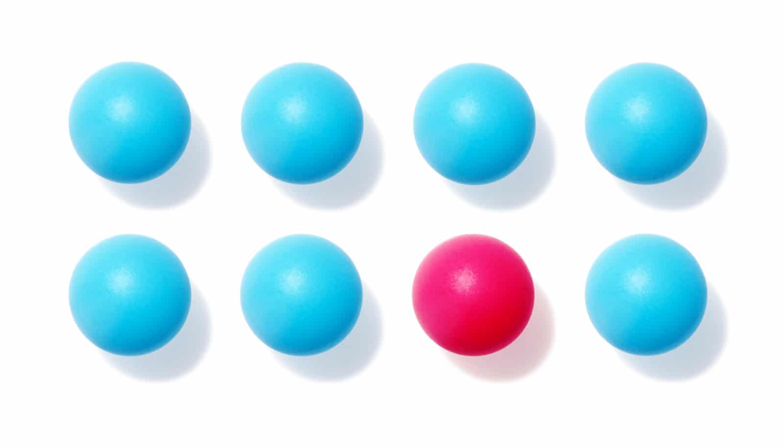 eight balls in two rows of four, one of which is pink, the rest are blue