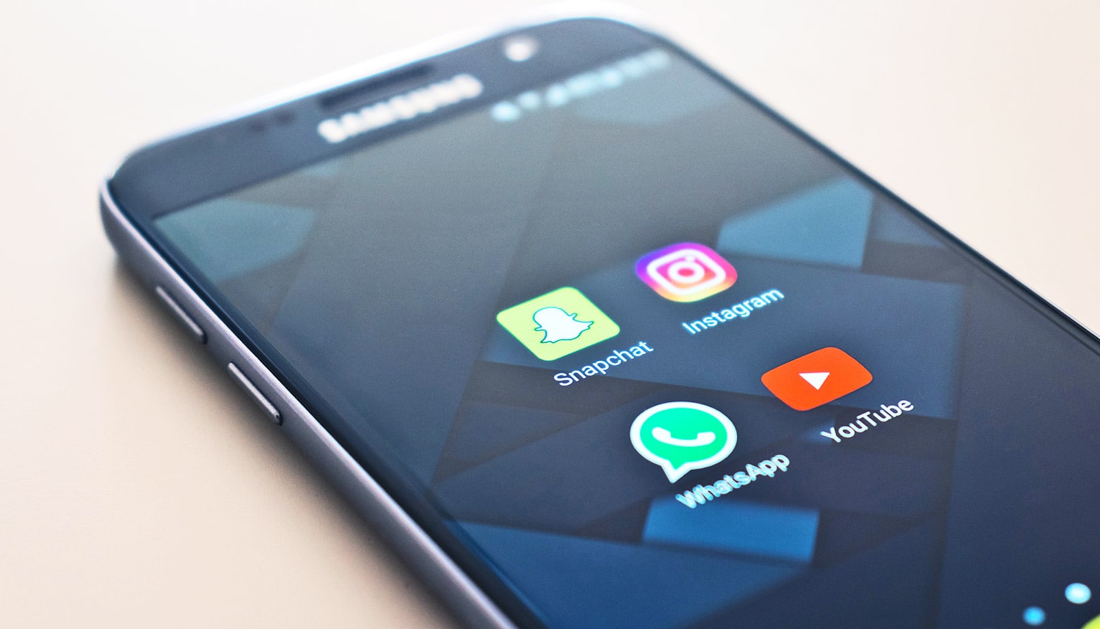 samsung smarthpone with snapchat, instagram, whatsapp, and youtube icons on screen