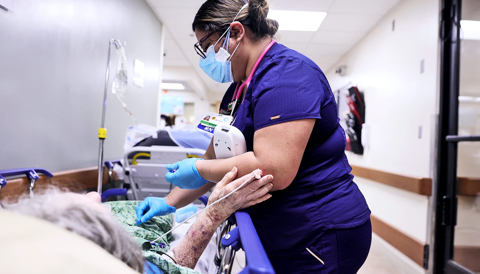 A nurse in scrubs stands beside a patient on a stretcher in a hospital hallway.