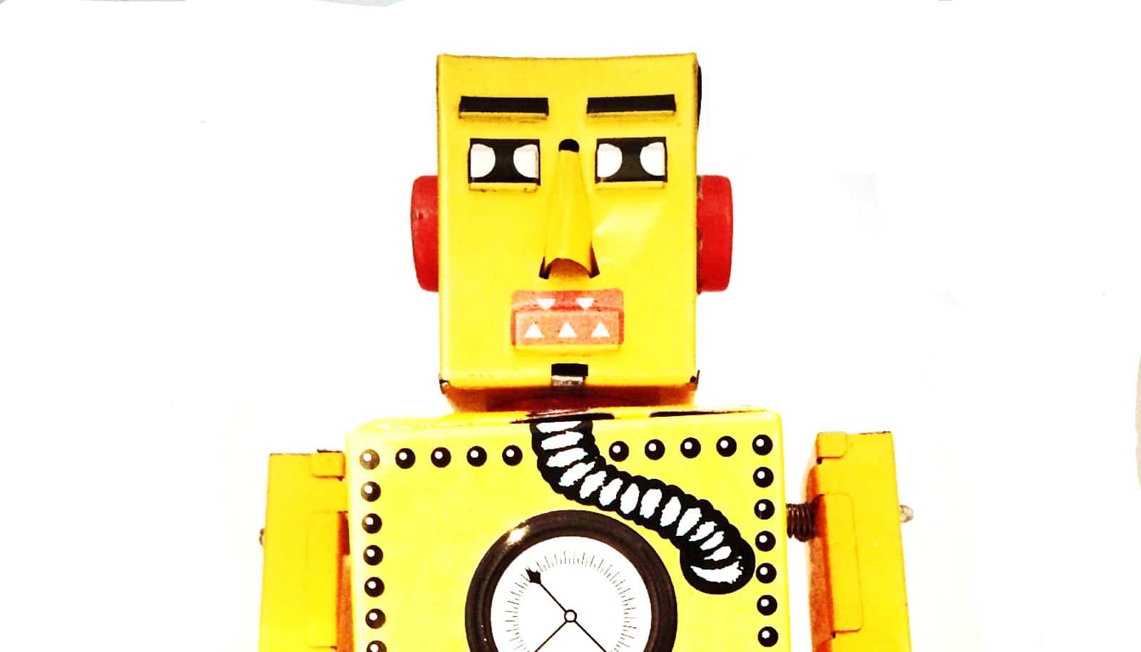 boxy yellow robot with serious face