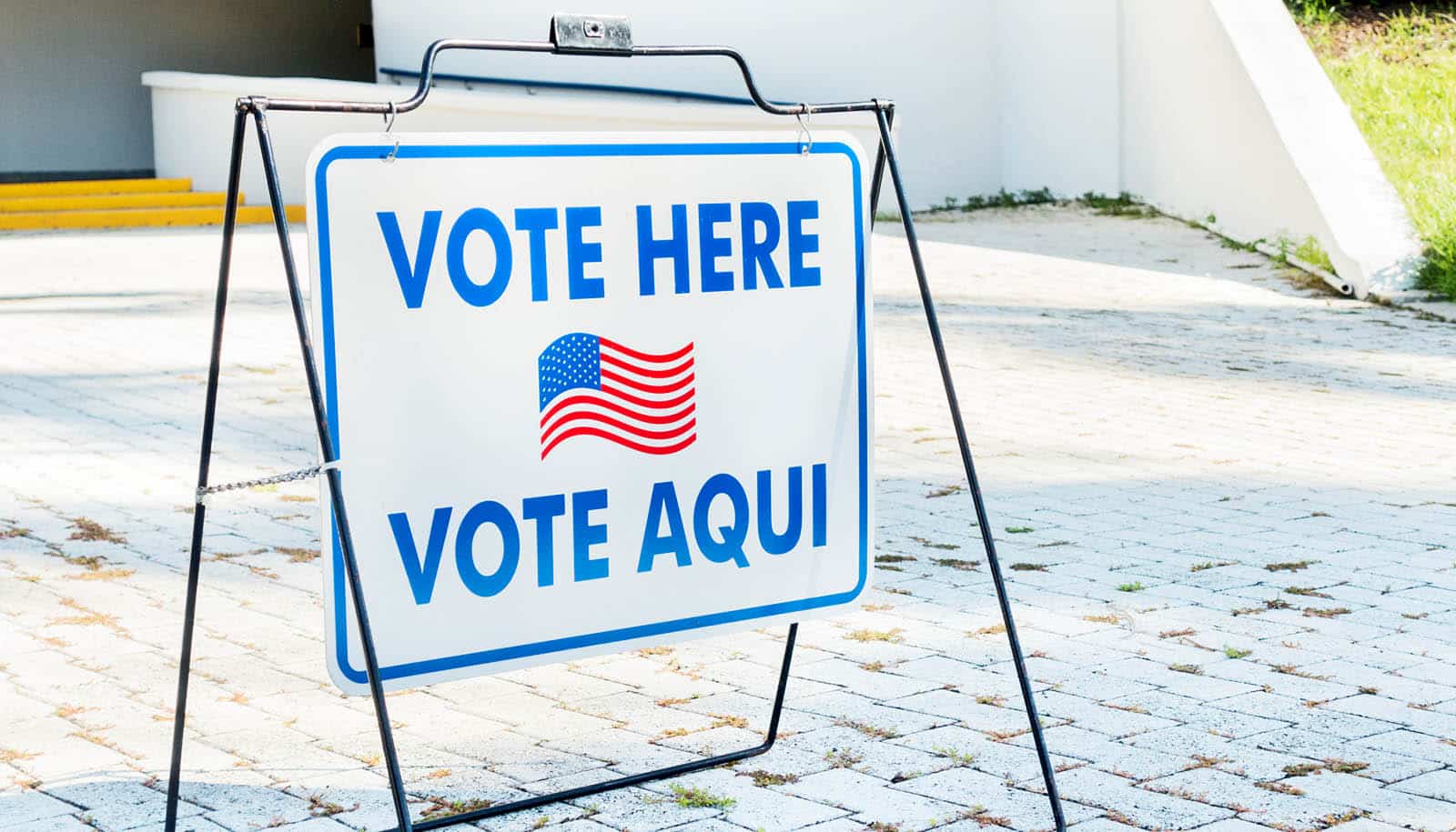 sign with US flag says "vote here" and "vote aqui"