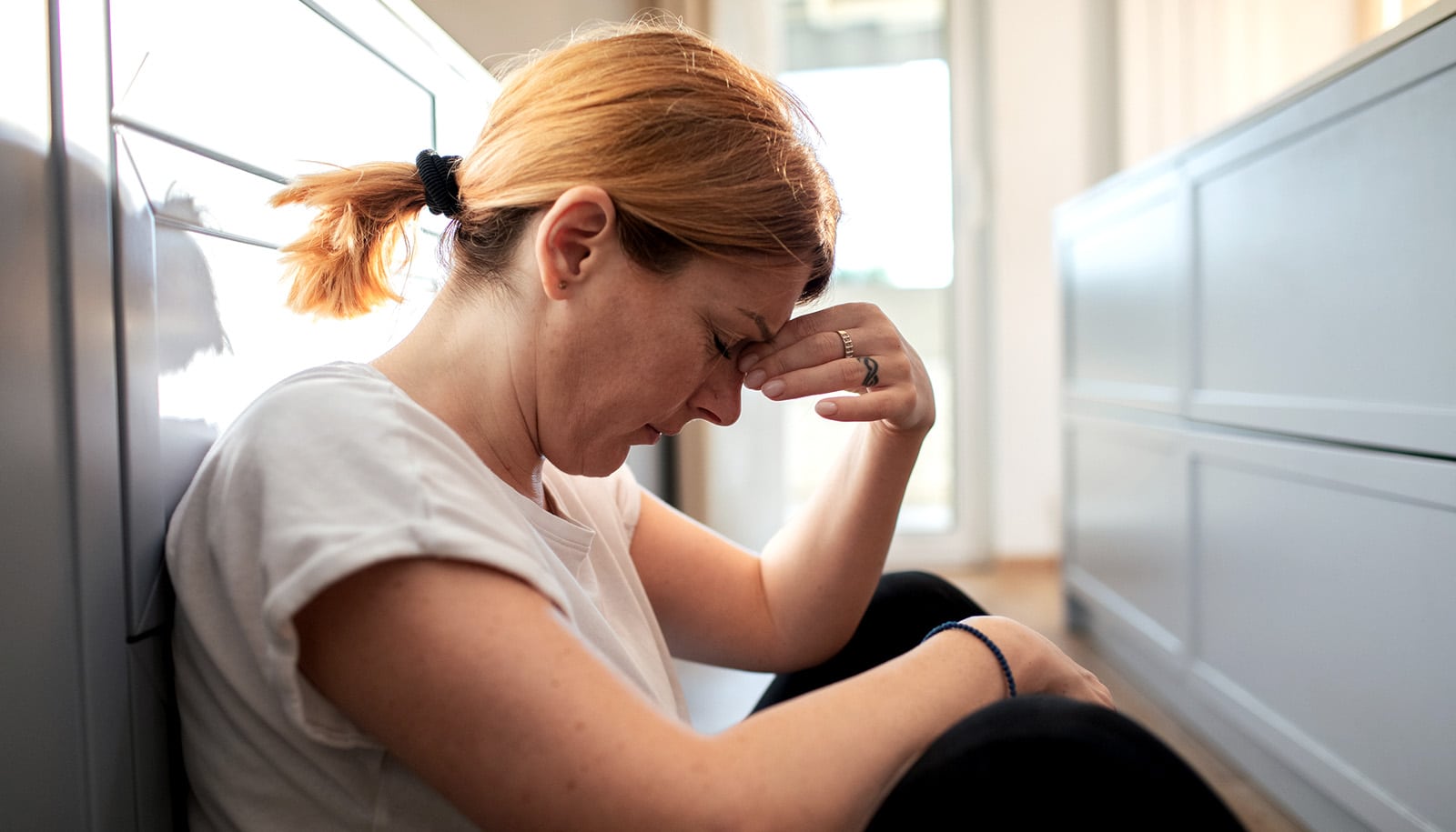 stressed out, sad person sits on floor
