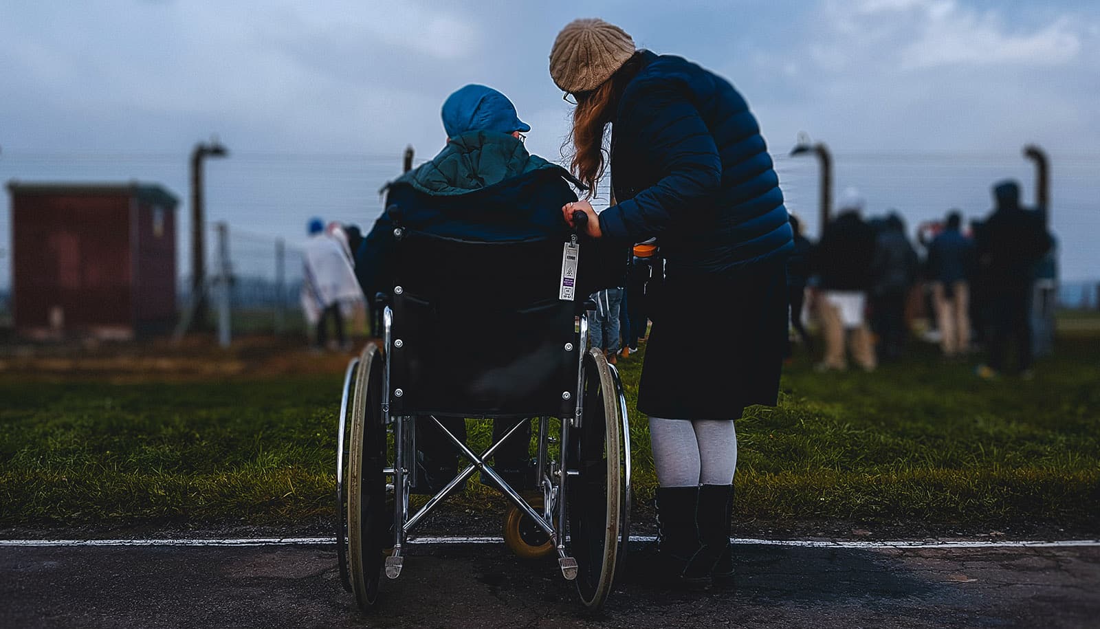 two people outdoors, one using wheelchair