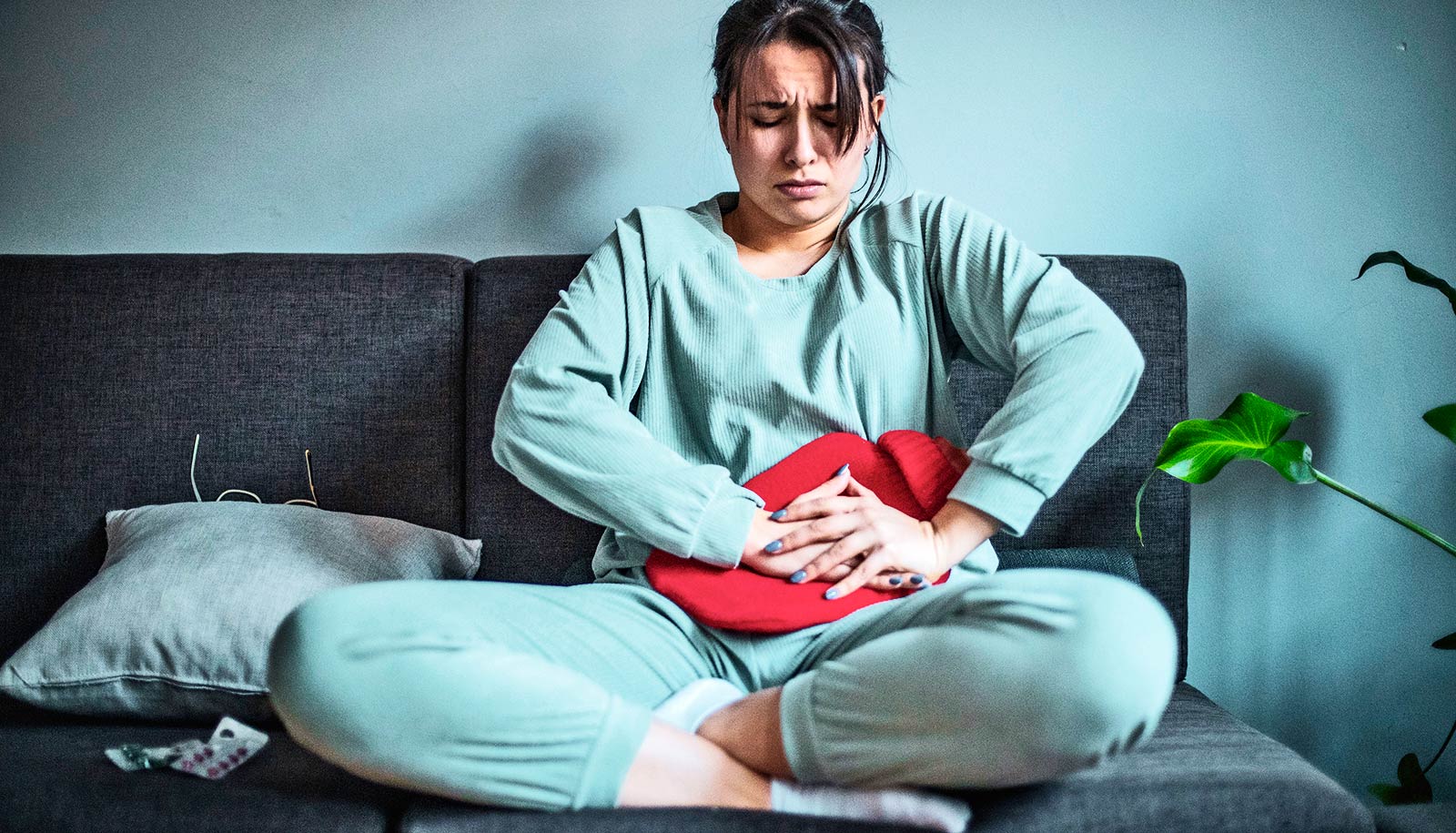 A woman grimaces in pain while sitting on a couch and holding a hot water bottle on her lap.