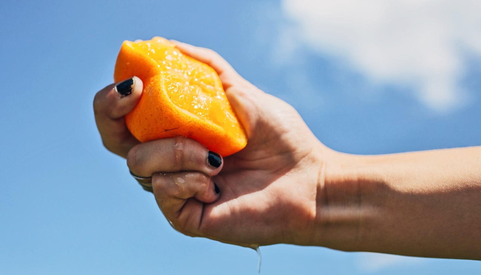 hand squeezes half an orange in front of blue sky