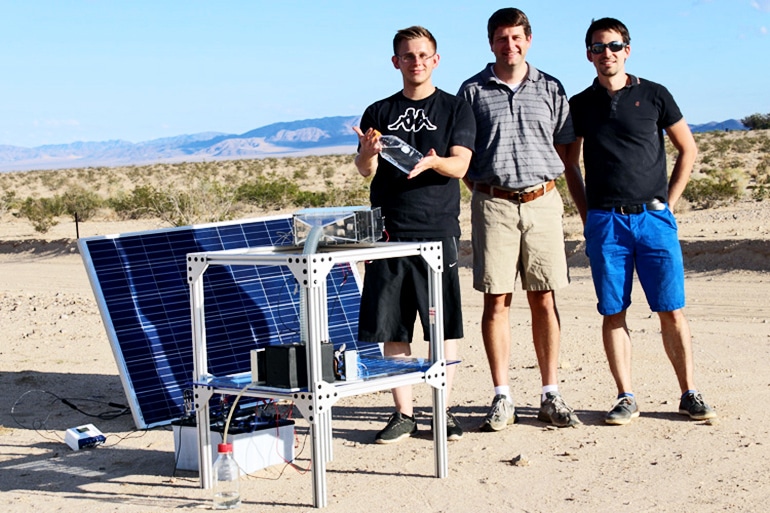 Three researchers stand in the desert near the water harvester setup, one of them holding a bottle of water