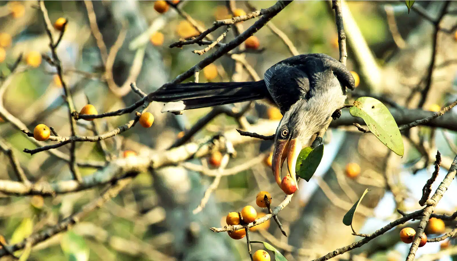 The tree’s seeds are distributed primarily by a specific species of hornbill, the Malabar grey hornbill, which eats the fleshy, fig-sized fruit and then excretes the seeds. Until now, it was not known how far the hornbills carry the seeds in their bodies. Theoretically, as the birds cover long distances, they could contribute to a rapid distribution of the tree species over a large area.